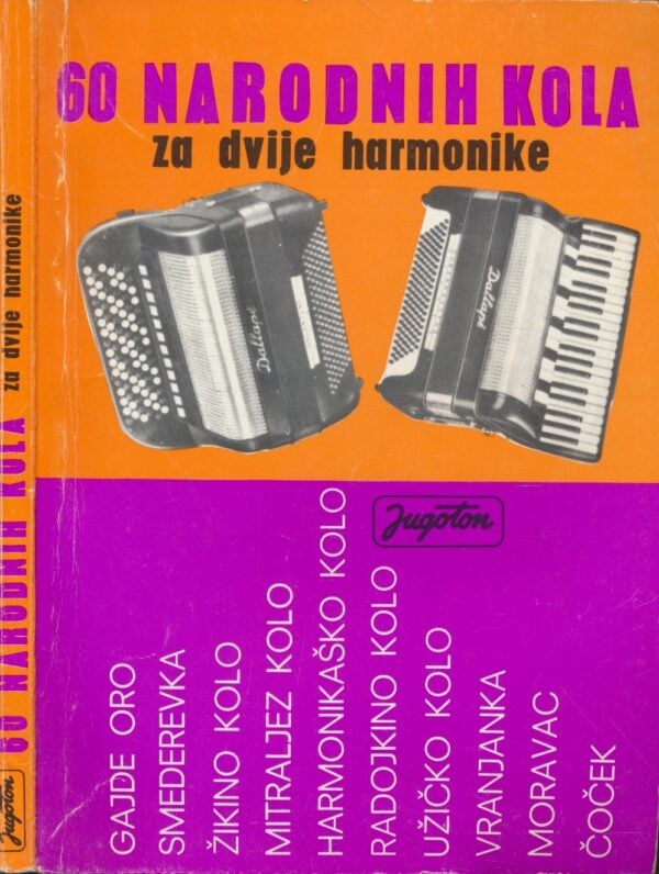 Zbirka donosi šezdeset narodnih kola prilagođenih za izvođenje na dvije harmonike, namijenjena kako učenicima tako i iskusnijim sviračima. Repertoar obuhvaća tradicionalne plesne napjeve s prostora bivše Jugoslavije, u aranžmanima koji omogućuju zajedničko muziciranje i scensku izvedbu. Notni zapisi pregledno su priređeni, što olakšava učenje i uvježbavanje, a izbor skladbi pruža uvid u bogatstvo i raznolikost folklorne glazbene baštine. Knjiga će posebno zanimati harmonikaše, voditelje folklornih ansambala i sve ljubitelje tradicijske glazbe koji žele proširiti svoj repertoar autentičnim narodnim kolima.